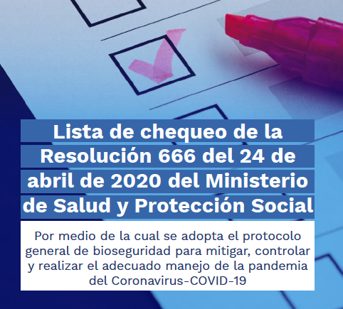 Nos permitimos poner a disposición de nuestros usuarios la LISTA DE CHEQUEO PARA EL CUMPLIMIENTO DE PROTOCOLOS DE BIOSEGURIDAD recientemente expedida por el Ministerio de Salud para la verificación y seguimiento de los procedimientos y auditoría de cumplimiento de la Resolución 666 de 2020 expedida por la entidad para protección, cuidado, prevención y mitigación de riesgo de contagio por COVID-19 en todos los sectores.